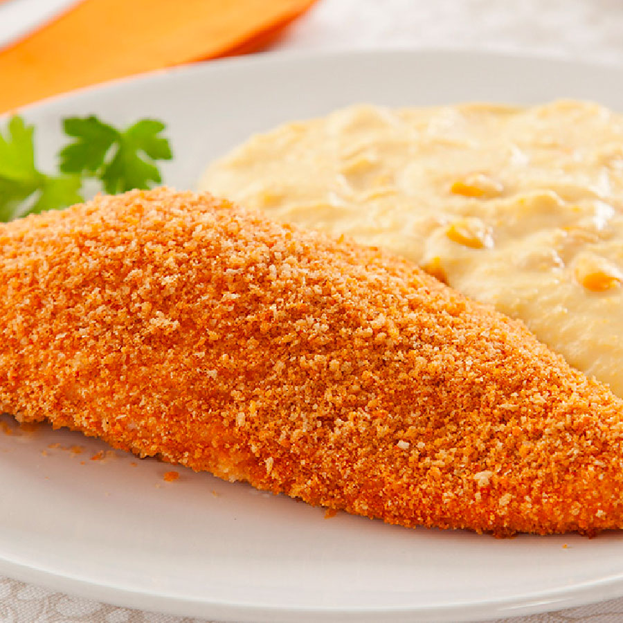 Cortar el filete de pollo en tiras no muy finas, sazonar al gusto, pasar por pan rallado, freír en aceite caliente, reservar.